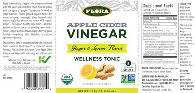 - Enjoy the crisp tang of apple cider vinegar combined with the sweet and refreshing citrus flavor of lemon and the spice of ginger. Thoughtfully brewed in small batches freshly ground organic herbs are water extracted overnight then blended with organic apple cider vinegar and infused with organic ginger—to support healthy digestion—and the essence of lemon for an undeniably sweet twist. Flora’s Ginger & Lemon Flavor Apple Cider Vinegar is bottled immediately after blending to capture optimum freshness.This wellness tonic is uniquely crafted with cleansing herbs found in Flor-Essence a renowned detox formula. Flora’s Ginger & Lemon Flavor Apple Cider Vinegar will rejuvenate your body and enliven your senses. Caffeine-Free + Gluten-Free Non-GMO Vegan Kosher Check Wellness tonic
