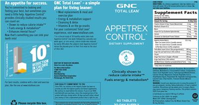 - Now that's something you can sink your teeth into!For best results combine with a diet and exercise plan like the one at www.totallean.com.Please recycle this box.GNC Total Lean; a simple plan for living leaner:Meal replacements & meal and exercise planEnergy & metabolism supportCleansing & detoxVitamins & on the go snacksFor your customized Total Lean experience visit www.totallean.comIn a clinical study of 30 healthy adults (who took Appretrex Control one week followed by a placebo one week apart or vice versa) calorie intake was reduced by nearly 10% when the subjects took Appetrex Control versus the placebo prior to their first meal at the start of their diet. Our quality commitment to youSince 1935 our mission as the industry leader has been to provide you with the highest-quality nutritional supplements. We continue to stand behind this mission. If you're not 100% satisfied with your purchase return the unused portion of the product with your receipt within 30 days and we'll either refund your money or find a replacement product that is right for you. Contributes to a total of 180 mg of caffeine.