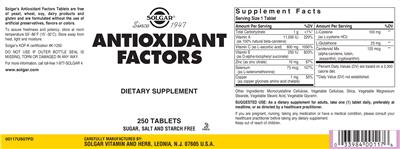 - Solgar's Antioxidant Factors Tablets are free of yeast wheat soy dairy products and gluten and are formulated without the use of artificial preservatives flavors or colors. Solgar's KOF-K certification #K-1250 Sugar salt and starch free