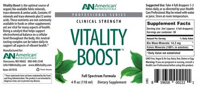 - Vitality Boost is the optimal source of organic bio-available fulvic acid minerals trace elements & amino acids. Contains 47 minerals and trace elements plus 12 amino acids. These nutrients are not commonly available in foods or other supplements yet are vital for many aspects of health. Being a catalyst that helps support electrochemical balance on a cellular level throughout the body this neutral tasting complex can be taken daily to support all aspects of vibrant health. Clinical strengthFull spectrum formula GMO free vegan & no soy dairy nut gluten or egg. GMO free vegan & no soy dairy nut gluten or egg.