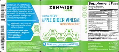 - Zenwise Health Apple Cider Vinegar is a dietary supplement that features 700 mg of apple cider vinegar per serving along with a powerful blend of spirulina kelp lecithin and bromelain. This nourishing formula supports digestion metabolism and weight loss to encourage a healthy well-being. Provides digestive system supportSupports metabolism & weight lossImmune system supportSupports skin health Maximum potencyDigestion supportImmune supportMetabolism supportWeight supportSkin support 700 mg apple cider vinegar per serving EggMilkPeanut
