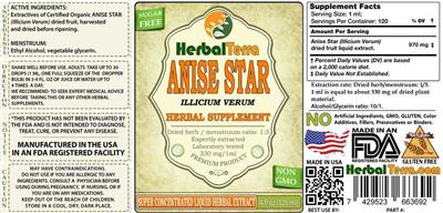 - Manufactured in the USA in an FDA registered facility Sugar free Illicium verum Dried herb/menstruum ratio: 1:3Expertly extractedLaboratory tested330 mg/1 mLPremium productSuper concentrated liquid herbal extract Non GMO No artificial ingredients GMO gluten color additives fillers preservatives or binders.Natural Gluten Free
