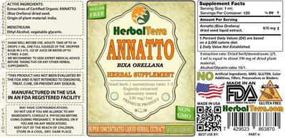 - Origin of plant material: India. Manufactured in the USA in an FDA registered facility Sugar free Bixa orellana Dried herb/menstruum ratio: 1:3Expertly extractedLaboratory tested330 mg/1 mLPremium productSuper concentrated liquid herbal extract Non GMO No artificial ingredients GMO gluten color additives fillers preservatives or binders.Natural Gluten Free