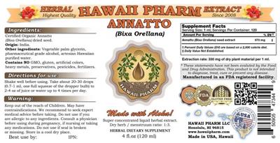 - Contains no GMO gluten artificial colors heavy metals preservatives pesticides fertilizers. (Bixa orellana) Super concentrated liquid herbal extract.Dry herb/menstruum ratio: 1:3. Manufactured in an FDA registered facility. Non GMOGluten free Made in USA Hawaii