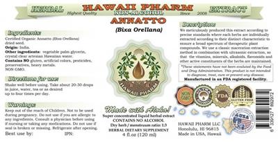 - Contains no gluten artificial colors pesticides preservatives heavy metals. Non GMO. (Bixa orellana) Super concentrated liquid herbal extractDry herb/menstruum ratio: 1:3 Contains no alcohol Description: We meticulously produced this extract according to precise standards where each herbs are individually extracted according to their distinct characteristic to ensure a broad spectrum of therapeutic plant compounds. We use a classic maceration extraction method in combination with ultrasonic extraction so that the vitamins minerals alkaloids flavonoids and other active constituents of the herbs are maintained. Manufactured in an FDA registered facility.Ultra Sonic Non GMOGluten free Made in USA Hawaii