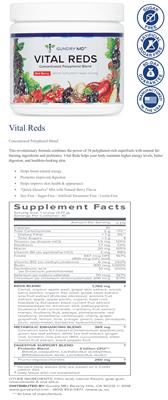 - Concentrated polyphenol blend Sugar freeArtificial sugar free Concentrated polyphenol blendThis revolutionary formula combines the power of 34 polyphenol-rich superfruits with natural fat-burning ingredients and probiotics. Vital Reds helps your body maintain higher energy levels better digestion and healthier-looking skin. Helps boost natural energyPromotes improved digestionHelps improve skin health & appearance 'Quick-Dissolve' mix with natural Berry Flavor Soy-free / Sugar-free / Artificial sweetener-free / Lectin-free