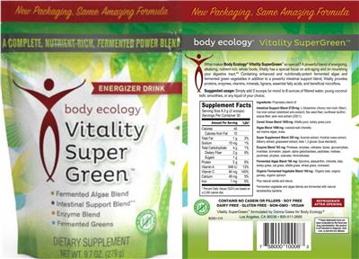 - A complete nutrient-rich fermented power blend Energizer drink Fermented algae blendIntestinal support blendEnzyme blendFermented greens What makes Body Ecology Vitality SuperGreen so special? A powerful blend of energizing alkalizing nutrient-rich whole foods Vitality has a special focus on anti-aging and on nourishing your digestive tract. Containing enhanced and nutritionally-potent fermented algae and fermented green vegetables in addition to a powerful intestinal support blend Vitality provides proteins enzymes vitamins mineral lignans essential fatty acids and beneficial microflora. Fermented vegetable and algae blends are fermented with natural organic lactobacillus bacteria. Contains no casein or fillersSoy freeDairy freeNon-GMO Vegan