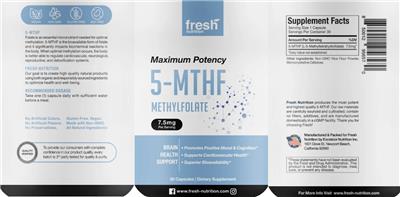 - Vegan Non GMOGluten freeSoy free 5-MTHFFolate is an essential micronutrient needed for optimal methylation. 5-MTHF is the bioavailable form of folate and it significantly impacts biochemical reactions in the body. When optimal methylation occurs the body is better able to regulate cardiovascular neurological reproductive and detoxification systems. No artificial colors.No artificial flavors.No preservatives.Made with Non-GMO all natural ingredients! Made with Non-GMO all natural ingredients! Maximum potency Methylfolate7.5 mg per serving Brain health supportPromotes positive mood & cognitionSupports cardiovascular healthSuperior bioavailability Fresh Nutrition produces the most potent and highest quality 5-MTHF. Our raw materials are carefully sourced and cultivated; contain no fillers additives and are manufactured domestically in a cGMP facility. Thank you for choosing Fresh!