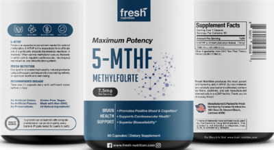 - Vegan Non GMOGluten freeSoy free 5-MTHFFolate is an essential micronutrient needed for optimal methylation. 5-MTHF is the bioavailable form of folate and it significantly impacts biochemical reactions in the body. When optimal methylation occurs the body is better able to regulate cardiovascular neurological reproductive and detoxification systems. No artificial colors.No artificial flavors.No preservatives.Made with Non-GMO all natural ingredients! Made with Non-GMO all natural ingredients! Maximum potency Methylfolate7.5 mg per serving Brain health supportPromotes positive mood & cognitionSupports cardiovascular healthSuperior bioavailability Fresh Nutrition produces the most potent and highest quality 5-MTHF. Our raw materials are carefully sourced and cultivated; contain no fillers additives and are manufactured domestically in a cGMP facility. Thank you for choosing Fresh!