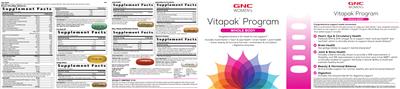 - Conforms to USP <2091> for weight.Meets USP <2040> for disintegration. Targeted solutions for head-to-toe support Includes multivitamin + heart & eye health + brain health + joint health + bone beauty & hormone formula + antioxidant & circulation + digestive enzymes Comprehensive support made convenient.With a multivitamin blend clinically proven to make you feel better plus targeted solutions for head-to-toe support our Women's Vitapak Program Whole Body has you covered.Heart Eye & Circulatory HealthFeatures EPA & DHA omega-3s to support heart and eye health and resVida which is clinically shown to support blood vessel dilation In a randomized double-blind placebo-controlled study of 112 healthy volunteers subjects taking the GNC vitamin and mineral blends for six weeks experienced significant improvements in serum levels of certain key nutrients compared to a placebo and a basic multivitamin formula based upon multivariate statistical analysis of a group of B-vitamins (thiamin niacin riboflavin pantothenic acid biotin folic acid and vitamins B-6 and B-12) and key antioxidants and cartenoids (a group of beta-carotene alpha-tocopherol selenium lutein lycopene). Statistical improvements in SF-36 Vitality and Mental Health scores were also observed compared to placebo. In a 12 week multi-center randomized double-blind placebo-controlled study of 60 adults subjects taking 250mg/day of the joint blend showed a significant 29.8% improvement in joint flexibility and a 19.4% improvement in joint function in 30 days compared to subjects on placebo.