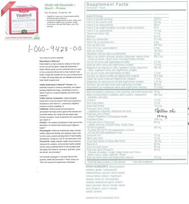 - Vitality 6(R) (Essentials + Heart) Women gives you the nutritional tools you need to live a productive life as well as help maintain heart health. Vitality 6(R) includes the four core products found in Vitality 4(R) (Essentials) plus two Melaleuca-exclusive heart health supplements: Vitality Multivitamin & Mineral(TM) Women --24 essential nutrients to enhance well-being with patent-pending Oligo(R) technology scientifically proven to deliver maximum mineral availability and antioxidant protection. Vitality Calcium Complete(R) -Helps strengthen bones with a 4-source calcium blend plus magnesium phosphorus and vitamin D -powered by Oligo(R) to maximize mineral availability. CellWise(R) --Patent-pending broad-spectrum antioxidant that helps protect against free radicals and promotes healthy skin using olive and grape seed extracts lycopene mixed tocopherols and carotenoids and vitamin C. Florify(R)--Two strains of probiotics to help improve the absorption of nutrients and maintain good digestive health. Phytomega(R)--Reduces cholesterol helps maintain healthy triglyceride levels and supports proper heart function using a patent-pending blend of heart-healthy phytosterols omega-3s CoQ10 and alpha lipoic acid. ProvexCV(R)--Helps maintain healthy blood pressure reduces LDL oxidation and promotes healthy platelet activity using a patented blend of natural grape seed and grape skin extracts resveratrol quercetin green tea extract and bromelain. Oligo(R) for maximum mineral absorbability and for antioxidant protection