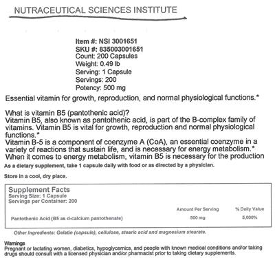 | Pantothenic Acid | vitamin | 500 | mg | 5000 | Adults and children 4 or more years of age | 1 Capsule(s) |