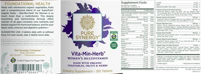 - Foundational health Made with wholesome organic vegetables fruits and a comprehensive blend of our SuperPure organic herbs-Vita-Min-Herb for Women is so much more than a multivitamin. This deeply nourishing and harmonizing formula offers women of all ages complete core nutrients and herbal support for hormonal balance and for your heart brain immune and digestive systems. Non GMO Made with organic vegetables fruits & herbs No GMO's dairy or gluten Cultured in a fermented food matrix: organic soy organic acacia organic Saccharomyces cerevisiae organic maltodextrin organic orange peel organic carrot organic alfalfa L. acidophilus B. bifidum L. rhamnosus papain & bromelain enzymes