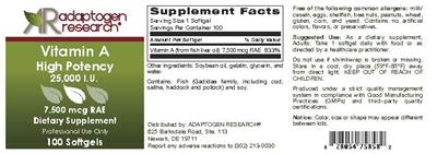 - Vitamin A High Potency25000 I.U.7500 mcg RAE Free of the following common allergens: milk/casein eggs shellfish tree nuts peanuts wheat gluten corn and yeast. Contains no artificial colors flavors or preservatives. Produced under a strict quality management system in compliance with Good Manufacturing Practices (GMPs) and third-party quality certifications. Notice: Color size or shape may appear different between lots.