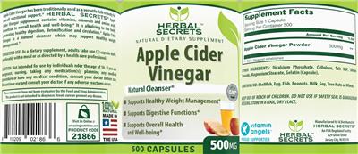 - Apple Cider Vinegar has been traditionally used as a versatile folk remedy for overall nutritional support. Herbal Secrets Apple Cider Vinegar supplement contains vitamins minerals and amino acids beneficial to overall health and well-being. It is alkalizing to the body promoting health digestion detoxification and circulation. Apple Cider Vinegar is a natural cleanser which may support healthy weight management. 100% natural Natural cleanserSupports healthy weight managementSupports digestive functionsSupports overall health & well-being Contains no: Shellfish egg fish peanuts milk soy tree nuts or wheat. Herbal Secrets; An FDA regulated facility