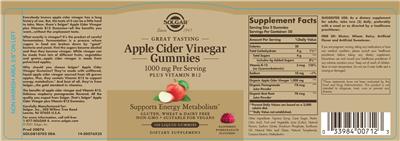 - Everybody knows apple cider vinegar has a long history of use. But the taste of it can be a little hard to take. Now there’s Solgar Apple Cider Vinegar plus Vitamin B12 Gummies—all the benefits you want…without the unpleasant taste. What exactly is vinegar? It’s the product of careful fermentation. Fermentation is a process where sugars in food are broken down by “good” bacteria and yeast. First the sugars become alcohol and then they become vinegar. While vinegar can be made from lots of different fruits vegetables and grains…apple cider vinegar is made from pulverized apples. Why should you choose Solgar Apple Cider Vinegar Gummies? They’re made with unfiltered liquid apple cider vinegar sourced from US grown apples. Plus they contain Vitamin B12 to support energy metabolism. And best of all they’re from Solgar … the gold standard in vitamins. Great tastingSupports energy metabolism Gluten wheat & dairy freeNon-GMO Suitable for vegans Free of: Gluten wheat dairy artificial flavor and artificial sweetener. Apple Cider Vinegar Gummies 1000 mg per servingPlus vitamin B12