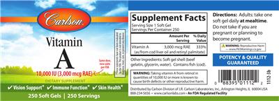 | Vitamin A | vitamin | 3000 | mcg RAE | 333 | Adults and children 4 or more years of age | 1 Softgel(s) |