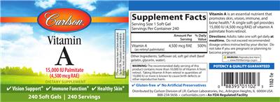 - Vision supportImmune functionHealthy skin Gluten-freeNo artificial preservatives Vitamin A is an essential nutrient that promotes skin vision immune and bone health. A single soft gel provides 15000 IU (4500 mcg RAE) of vitamin A palmitate from retinol. Potency & quality guaranteedAn FDA regulated facility