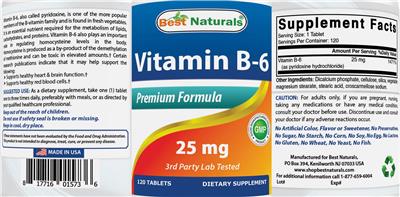 - Vitamin B-6 also called pyridoxine is one of the more popular members of the B-vitamin family and is found in fresh vegetables. It is an essential nutrient required for the metabolism of lipids carbohydrates and proteins. Vitamin B-6 also plays an important role in regulating homocysteine levels in the body. Homocysteine is produced as a by-product of the demethylation of methionine and can be toxic in elevated amounts. Certain research publications indicate that it may help support the following:Supports healthy heart & brain function.Supports healthy red blood cells. Premium formula 3rd party lab tested No artificial color flavor or sweetener no preservatives no sugar no starch no corn no soy no egg no lactose no gluten no wheat no yeast no fish.