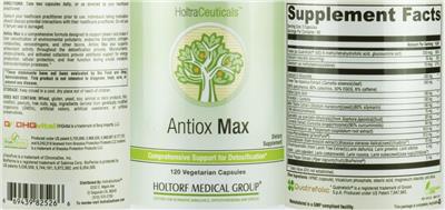 - Consult your healthcare practitioner prior to use. Do not use if tamper seal is damaged. Antiox Max is a comprehensive formula designed to support phase I and phase II liver detoxification of environmental pollutants endocrine disruptors estrogen metabolites xenoestrogens and other toxins. Antiox Max also supports antioxidant activity throughout the detoxification process. Micronutritents phytonutrients and activated cofactors provide additional support for energy production cellular protection and liver function during crucial metabolic biotransformation processes. Does not contain: Wheat gluten yeast soy animal or dairy products fish shellfish peanuts tree nuts egg ingredients derived from genetically modified organisms (GMOs) artificial colors artificial sweeteners or artificial preservatives. Comprehensive support for detoxification Vegetarian Caps Manufactured in a GMP compliant facility.