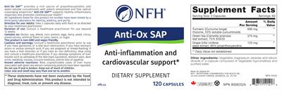 - Anti-ox SAP provides a rich source of proanthocyanidins and water-soluble curcuminoids with potent antioxidant and free radical scavenging properties. Anti-OX SAP supports healthy inflammatory responses and promotes cardiovascular health. All ingredients listed for this product lot number have been tested by a third-party laboratory for identity potency and purity. Contains no: Gluten soy wheat corn protein eggs dairy yeast citrus preservatives artificial flavor or color starch or sugar. This product is non-GMO and vegan friendly. This product is non-GMO and vegan friendly. Color size and smell may vary from one lot to another. Anti-inflammatory and cardiovascular support Made in Canada