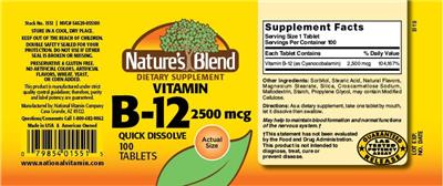 | Vitamin B12 | vitamin | 2500 | mcg | 104167 | Adults and children 4 or more years of age | 1 Tablet(s) |