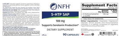 - 5-HTP SAP naturally supports serotonin production helping to regulate normal sleep positive mood appetite control and body temperature. All ingredients listed for this product lot number have been tested by a third-party laboratory for identity potency and purity. Contains no: Gluten soy wheat corn eggs dairy preservatives artificial flavor or color starch or sugar. This product is non-GMO and vegan friendly. This product is non-GMO and vegan friendly. Color size and smell may vary from one lot to another. Supports serotonin production Made in Canada