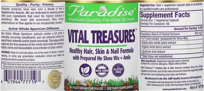 - Quality Purity Potency We never add unnecessary fillers binders preservatives or flow agents to our encapsulation process. Active whole spectrum difference Our active whole spectrum extracts contain a full profile of naturally occurring constituents and are extracted without the use of toxic solvents and/or harsh chemicals. Active whole spectrum difference Our active whole spectrum extracts contain a full profile of naturally occurring constituents and are extracted without the use of toxic solvents and/or harsh chemicals. This unique method captures the true essence of the whole herb while still retaining a highly active and bioavailable concentration of phyto nutrients. Healthy hair skin & nail formula with prepared He Shou Wu + Amla Vegan Made with Non-GMO ingredientsGluten free Contains no common allergens. Made without fillers. Vital Treasures Healthy Hair & Skin formula contains Shou Wu Eclipta Ligustrum and Amla four of the most renowned herbs for supporting healthy hair and skin and maintaining hair color and fullness. Manufactured in the USA. GMP Quality Assured & FDA Registered.