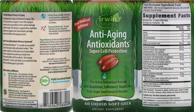 - The free radical theory of aging Free radicals are a major contributor to aging. The 'free radical theory of aging' states that aging is caused by the accumulation of free radical damage inside the body. This theory is supported by countless studies and suggests that antioxidants can help reduce the effects of the aging process. Boost your antioxidant defense systems! Anti-Aging Antioxidants is a simple yet powerful way to boost your daily antioxidant intake. This product supplies a broad spectrum of antioxidant active compounds to protect your body from the harmful effects of free radicals. What makes us different: Liquid soft-gels The nutrients in these easy-to-swallow liquid soft-gels are released fast. Other forms of delivery can contain binders and fillers that may cause stomach upset and offer no nutritional value. Advanced liquid soft-gels provide an optimum delivery system. Quality assurance Irwin Naturals is committed to providing the highest quality products for your health. We employ compliance testing to ensure purity and potency. Patented BioPerine Our special BioPerine Complex enhances the bioavailability absorption and potency of many nutrients. Pro-Active Antioxidant Formula with Glutathione Coffeeberry Brand Coffee Fruit Grape seed extract & Vitamin C No preservatives added. Free radical defense Super cell protection