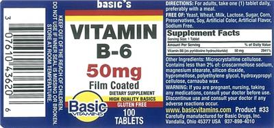 | Vitamin B6 | vitamin | 50 | mg | 2941 | Adults and children 4 or more years of age | 1 Tablet(s) |