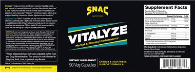 - Vitalyze helps promote alertness elevates healthy mood and supports concentration and reaction time during exercise. It also supports both the body's normal stress response and physical work capacity. Mental & Physical Performance Energy & Alertness Support Formula Vitalyze contains copper which may support healthy connective tissue ligaments and tendons.