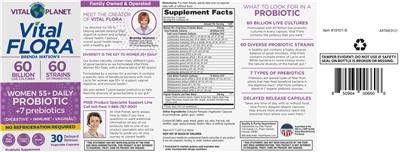 - 60 Billion Live Cultures 60 Strains of Probiotics Women 55+ Daily Probiotic +7 prebiotics Women 55+ Daily Probiotic +7 prebiotics Digestive + Immune + Vaginal Non GMO Gluten Free Vegan Diversity is the key to Women 55+ Daily Our bodies naturally contain many different types of good bacteria so we formulated Vital Flora Women 55+ Daily with a diverse blend of 60 strains. Formulated by women for women it contains a special ratio of beneficial bacteria with more Lacto for women 55+ to support vaginal digestive and immune health. We also added 7 plant-based prebiotics to help feed the diversity of good bacteria in our gut. Contains no GMOs yeast wheat gluten soy dairy tree nuts salt shellfish sugar animal products binders fillers or artificial ingredients. What to look for in a probiotic 60 Billion Live Cultures Formulated with 60 billion live probiotic cultures in every capsule Vital Flora contains the potency that you want. 60 Diverse Probiotic Strains A healthy gut contains a highly diverse balance of good microbes. Vital Flora contains multiple strains of Lacto and Bifido bacteria to more closely mirror the natural diversity of the human gut. 7 Types of Prebiotics Prebiotics are special types of fiber from plants that help feed beneficial bacteria in the digestive tract. Vital Flora contains a blend of 7 organic prebiotic sources. Delayed Release Capsules Taken any time of day with or without food Vital Flora's delayed release capsules help ensure more probiotics reach the intestinal tract where you want them Quality & Purity Guaranteed Assembled in a facility in the USA that is GMP (Good Manufacturing Practices)