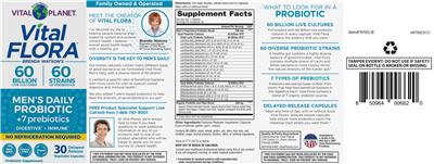 - 60 Billion Live Cultures 60 Strains of Probiotics Men's Daily Probiotic + 7 prebiotics Men's Daily Probiotic + 7 prebiotics Digestive + Immune Non GMO Gluten Free Vegan Diversity is the key to Men's Daily Our bodies naturally contain many different types of good bacteria so we formulated Vital Flora Men's Daily with a diverse blend of 60 strains. It contains a special ratio of beneficial bacteria with more Lacto for men to support overall digestive and immune health. We also added 7 plant-based prebiotics to help feed the diversity of good bacteria in our gut. Contains no GMOs yeast wheat gluten soy dairy tree nuts salt shellfish sugar animal products binders fillers or artificial ingredients. What to look for in a probiotic 60 Billion Live Cultures Formulated with 60 billion live probiotic cultures in every capsule Vital Flora contains the potency that you want. 60 Diverse Probiotic Strains A healthy gut contains a highly diverse balance of good microbes. Vital Flora contains multiple strains of Lacto and Bifido bacteria to more closely mirror the natural diversity of the human gut. 7 Types of Prebiotics Prebiotics are special types of fiber from plants that help feed beneficial bacteria in the digestive tract. Vital Flora contains a blend of 7 organic prebiotic sources. Delayed Release Capsules Taken any time of day with or without food Vital Flora's delayed release capsules help ensure more probiotics reach the intestinal tract where you want them. Quality & Purity Guaranteed