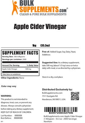 | Apple Cider Vinegar | botanical | 500 | mg | N/A | Adults and children 4 or more years of age | 500 mg |