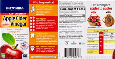 - Made from Raw; Unfiltered Apple Cider Vinegar with the 'Mother' 10 real apples in every bottle Made with USA grown apples Supports digestion & weight loss One dose is comparable to 1 oz of liquid Non GMO Certified by NSF Vegan Dietary Supplement Why Enzymedica? The Power of Nature Apple Cider Vinegar (ACV) is a traditional folk remedy that has been shown to support digestion and weight loss. Real Apples A single bottle of Enzymedica's ACV capsules is produced from 10 real apples that are pressed and fermented. We strive to provide the greatest benefits intended by nature. Teeth Friendly Liquid ACV has been shown to cause damage to tooth enamel. Capsules eliminate that challenge by bypassing your teeth and delivering the ingredients exactly where they need to go. Bad Taste? No Problem Vinegar isn't always tasty. ACV capsules don't have a bad taste and art simple to swallow. Contains NO: Gluten milk casein soy egg artificial colors or flavors Added sugar No Contains 'the Mother' & her 4 organic acids: Acetic lactic citric malic Yes