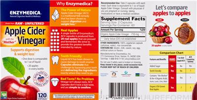 - Made from raw; unfiltered Apple Cider Vinegar With the 'Mother' 20 apples in every bottle Supports digestion & weight loss One dose is comparable to 1 oz of liquid Non GMO Certified by NSF Vegan Dietary Supplement Why Enzymedica? The power of nature Apple cider vinegar (ACV) is a traditional folk remedy that has been shown to support digestion and weight loss. Real apples A single bottle of Enzymedica's ACV capsules is produced from 20 real apples that are pressed and fermented. We strive to provide the greatest benefits intended by nature. Teeth friendly Liquid ACV has been shown to cause damage to tooth enamel. Capsules eliminate that challenge by bypassing your teeth and delivering the ingredients exactly where they need to go. Bad taste? No problem Vinegar isn't always tasty. ACV capsules don't have a bad taste and are simple to swallow. Contains no: Gluten milk casein soy egg artificial colors or flavors Added sugar No Contains ' the Mother' & her 4 Organic acids: Acetic Lactic Citric Malic Yes Organic USA Grown Real Apples Yes