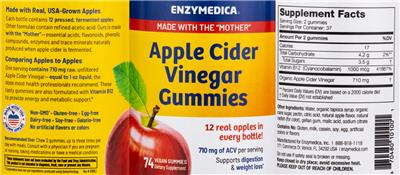 - Made with real-USA-grown apples Each bottle contains 12 pressed fermented apples. Other formulas contain refined acetic acid. Ours is made with the 'Mother'-essentials acids flavonoids phenolic compounds enzymes and trace minerals naturally produced when apple cider is fermented. Comparing Apples to Apples One serving contains 710 mg raw unfiltered Apple Cider Vinegarequal to 1 oz liquid the dose most health professionals recommend. These tasty gummies are also formulated with Vitamin B12 to provide energy and metabolic support. Non-GMO Gluten-free Egg-free Dairy-free Soy-free Gelatin-free No artificial flavors or colors Enzymedica does not use ingredients produced using biotechnology. Made with the 'Mother' 12 real apples in every bottle! 710 mg of ACV per serving Supports digestion & weight loss Contains No: Gluten milk casein soy egg artificial colors or flavors.