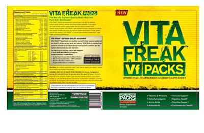- VITA FREAK(TM)SUPERIOR-QUALITY ASSURANCEVITA FREAK(TM) ingredients are carefully sourced for their superior quality and are tested to ensure proper purity and potency.* VITA FREAK(TM) PACKS VITA FREAK(TM)PACKS are engineered to provide your body with the absolute highest-quality vitamins minerals and micronutrients available!* If you expect your body to have superior-quality health then you need to provide it with superior-quality nutrients. VITA FREAK’s gold-standard formula is designed to optimize every aspect of health and prime your body for greater performance muscle growth strength and recovery!* VITA FREAK(TM) is a multi-vitamin/mineral stacked with 7 other health-promoting supplements!* The FDA-inspected facility where VITA FREAK(TM) is made holds the following prestigiousQuality Assurance Certifications:Quality Assurance International (QAI) CertificationNatural Products Association – GMP CertificationNew York State Board of Pharmacy – Registered Manufacturer Certification VITA FREAK(TM) AMINO COMPLETE(TM) and PHARMAFREAK(TM) are trademarks of PharmaFreak Holdings Inc.BIOPERINE(R) is a registered trademark of Sabinsa Corporation.US Patents #5536506; #5744161; #5972382 and #6054585.Dietary