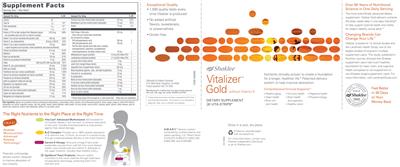 - The right nutrients to the right place at the right time Patented cutting-edge delivery system designed to improve absorption of key nutrients. Vita-Lea advanced multivitamin Microcoated for immediate release in the stomach to enhance absorption of folic acid. Includes N-acetylcysteine to help protect against free radical damage. B+C complex Provides up to 198% greater absorption of B vitamins over 12 hours as shown in a clinical study through sustained-release delivery to the small intestine. Caroto-E-Omega Ultra-pure omega-3 fatty acids sustainably sourced from wild fish from pure Alaskan waters plus carotenoids and vitamin E delivered to the upper intestine. Includes heart-healthy CoQ10. Optiflora pearl probiotic Delivers healthy microflora to the lower intestine through triple-layer encapsulation technology protecting them from stomach acid. Exceptional quality 1000 Quality tests every time Vitalizer is produced No added artificial flavors sweeteners or preservatives Gluten free Nutrients clinically proven to create a foundation for a longer healthier life. Patented delivery system to help improve absorption. Comprehensive formula supports: Healthy aging Heart health Bone and joint health Immune health Brain health and cognition Healthy vision Digestive health Physical energy Over 60 years of nutritional science in one daily serving The most scientifically advanced dietary supplement Vitalizer Gold delivers nutrients the body needs daily in one easy Vita-Strip to help support optimal health and vitality for today's healthy active adult.