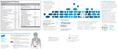 - S.M.A.R.T. Shaklee Micronutrient Advanced Release Technology Vita-Lea Advanced Multivitamin Microcoated for immediate release in the stomach to enhance absorption of folic acid. B+C Complex Provides up to 198% greater absorption of B vitamins over 12 hours as shown in a clinical study through sustained-release delivery to the small intestine. Caroto-E omega Ultra-pure omega-3 fatty acids sustainably sourced from wild fish from pure Alaskan waters plus carotenoids and Vitamin E delivered to the upper intestine. Optiflora Pearl Probiotic Delivers healthy microflora to the lower intestine through triple-layer encapsulation technology protecting them from stomach acid. Exceptional quality 1000 quality tests every time Vitalizer is produced No added artificial flavors sweeteners or preservatives Gluten free Nutrients clinically proven to create a foundation for a longer healthier life. Comprehensive formula supports: Heart health Prostate health Immune health Physical energy Joint health Muscle function Digestive health Healthy blood pressure The most scientifically advanced dietary supplement Vitalizer Men delivers nutrients the body needs daily in one easy Vita-Strip to help support optimal health and vitality for today's healthy active adult man.