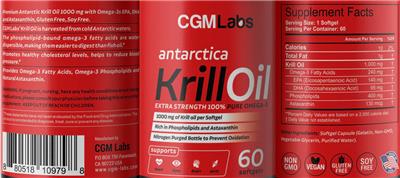 - Premium Antarctic Krill Oil 1000 mg with Omega-3s EPA DHA and Astaxanthin Gluten Free Soy Free. CGM Labs Krill Oil is harvested from cold Antarctic waters. The phospholipid-bound omega-3 fatty acids are water dispersible making them easier to digest than fish oil. Promotes healthy cholesterol levels helps to reduce blood pressure. Provides Omega-3 Fatty Acids Omega-3 Phospholipids and Natural Astaxanthin. Premium Antarctic Krill Oil 1000 mg with Omega-3s EPA DHA and Astaxanthin Gluten Free Soy Free. Promotes healthy cholesterol levels helps to reduce blood pressure. Extra Strength 100% Pure Omega-3 1000 mg of Krill oil per Softgel Rich in phospholipids and astaxanthin Nitrogen purged bottle to prevent oxidation Supports Heart Eyes Brain Joint Non GMO Gluten Free Soy Free Vegan
