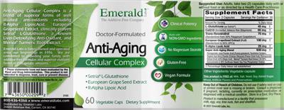 - Anti-Aging Cellular Complex is a blend of superior forms of well studied anti-oxidants including R-Alpha LipoicAcid European Grapeseed Extract clinically-proven Setria L-Glutathione a known Liver-Detoxifying Anti-Oxidant and Meriva Turmeric Root Extract. We are committed to providing your family with additive-free formulas and superior nutrient forms in therapeutic amounts. Setria L-Glutathione European Grape Seed Extract R-Alpha Lipoic Acid Clinical Potency Made with Non-GMO Ingredients No Magnesium Stearate Gluten-Free Vegan Formula This product is free of: Milk salt yeast soy added sugar wheat artificial flavors and preservatives.