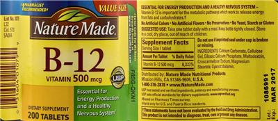 | Vitamin B12 | vitamin | 500 | mcg | 8333 | Adults and children 4 or more years of age | 1 Tablet(s) |