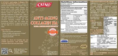 - Catalo Anti-Aging Collagen HA Total Revitalizing Essence contains the patented ingredient BioCell Collagen which derived from chicken sternal cartilage. The patented process yields smaller molecules that can be easily absorbed through the skin or the digestive system. Its unique HA content; an important component of youthful skin; bind to water which increase the skin's supple elasticity and help proliferation of heathy skin cells. Catalo Anti-Aging Collagen HA Total Revitalizing Essence does not contain any hormone and antibiotic. It supports joint health and also helps you to minimize the traces of aging. Main Functions: Boost skin moisture and elasticity Reduce wrinkles and appearance of aging Smooth skin and even skin tone Support joint health Suitable for: Desire for beautiful skin and youthful appearance want healthy joints concerned about skin and joint health Lifting Stephen R. S. (2012) Clin. Inter. in Ag. Vol 7 pp267-273 (Refer to BioCell Collagen) This product is made from natural sources and may have color variation. This is a normal phenomenon and does not affect product quality. Made with BioCell Collagen Made in USA
