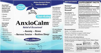 - AnxioCalm is the safe and effective way to help relieve occasional: Anxiety Stress Nervousness and worry And related symptoms such as: Nervous sweating Upset stomach Muscle tension Insecurity Occasional restless sleep Clinically studied Relieve anxiety & stress Calm your nerves Fast-acting Relief of occasional Nervous tension Restless sleep Safe and effective Relieves occasional anxiety and stress AnxioCalm is perfect for everyday use or occasionally when you need extra support. It provides relief when you need it without drowsiness or mental fogginess. It's non-drowsy non-addictive and safe. Great for adults and children (age 4 and up)! Anxious? Overwhelmed? Stressed? AnxioCalm is clinically studied to quiet your nerves and relieve your occasional anxiety; without drowsiness! No salt yeast wheat gluten corn soy artificial flavoring or artificial preservatives. Terry Naturally brand products contain natural and other premium ingredients. Developed by Researchers at the Hungarian Academy of Sciences. Budapest Hungary Non-GMO Lab tested for purity & quality Product of Hungary