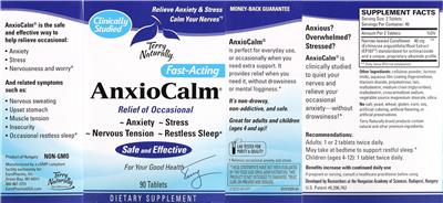 - AnxioCalm is the safe and effective way to help relieve occasional: Anxiety Stress Nervousness and worry And related symptoms such as: Nervous sweating Upset stomach Muscle tension Insecurity Occasional restless sleep Product of Hungary Non-GMO Clinically studied Relieve anxiety & stress Calm your nerves Relieves occasional anxiety and stress Fast-acting Relief of occasional Anxiety Stress Nervous tension Restless sleep Safe and effective Relieves occasional anxiety and stress AnxioCalm is perfect for everyday use or occasionally when you need extra support. It provides relief when you need it without drowsiness or mental fogginess. It's non-drowsy non-addictive and safe. Great for adults and children (ages 4 and up)! Anxious? Overwhelmed? Stressed? AnxioCalm is clinically studied to quiet your nerves and relieve your occasional anxiety; without drowsiness! No salt yeast wheat gluten corn soy artificial coloring artificial flavoring or artificial preservatives. Terry Naturally brand products contain natural and other premium ingredients.