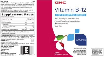 - Each B-12 5000 fast-dissolving lozenge dissolves quickly to facilitate optimal absorption. Vitamin B-12 is essential for metabolism energy production and red blood cells. B-12 and folate play an essential role in the maintenance of normal homocysteine levels important for cardiovascular health. Conforms to USP <2091> for weight. No artificial colors no preservatives sodium free no soy no dairy. Quick dissolving for easier absorption Essential for carbohydrate metabolism & energy production Sugar free Cherry natural & artificial flavor