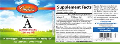 - Vision support Immune function Healthy skin Some ingredient separation may occur within soft gels. An FDA regulated facility Vitamin A plays an important role in helping the eyes adapt to light changes and supports healthy skin and immune function. Each soft gel contains 7500 mcg RAE (25000 IU) of vitamin A from fish liver oil and retinyl palmitate. The vitamin A is dispersed with apple pectin. Gluten free No artificial preservatives Potency and quality guaranteed
