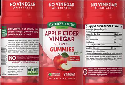 - No vinegar aftertaste No gluten wheat yeast milk lactose soy artificial flavor artificial sweetener. Non-GMO Vegan formula Our Non-GMO Pledge Visit our website Apple cider vinegar 600 mg per serving No harsh aftertaste Gluten free Nature's Truth Apple Cider Vinegar Gummies contain a delicious natural apple flavor that has no harsh aftertaste. Each serving contains 600 mg of apple cider vinegar all in convenient vegan gummies.