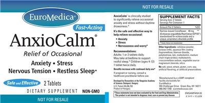- Fast-acting Relief of occasional Anxiety Stress Nervous tension Restless sleep Safe and effective Non-GMO AnxioCalm is clinically studied to significantly relieve occasional anxiety and stress without daytime drowsiness. It's the safe and effective way to help relieve occasional: Anxiety Stress Nervousness and worry Developed by Researchers at the Hungarian Academy of Sciences. Budapest Hungary Product of Hungary No salt yeast wheat gluten corn soy artificial flavoring or artificial preservatives.